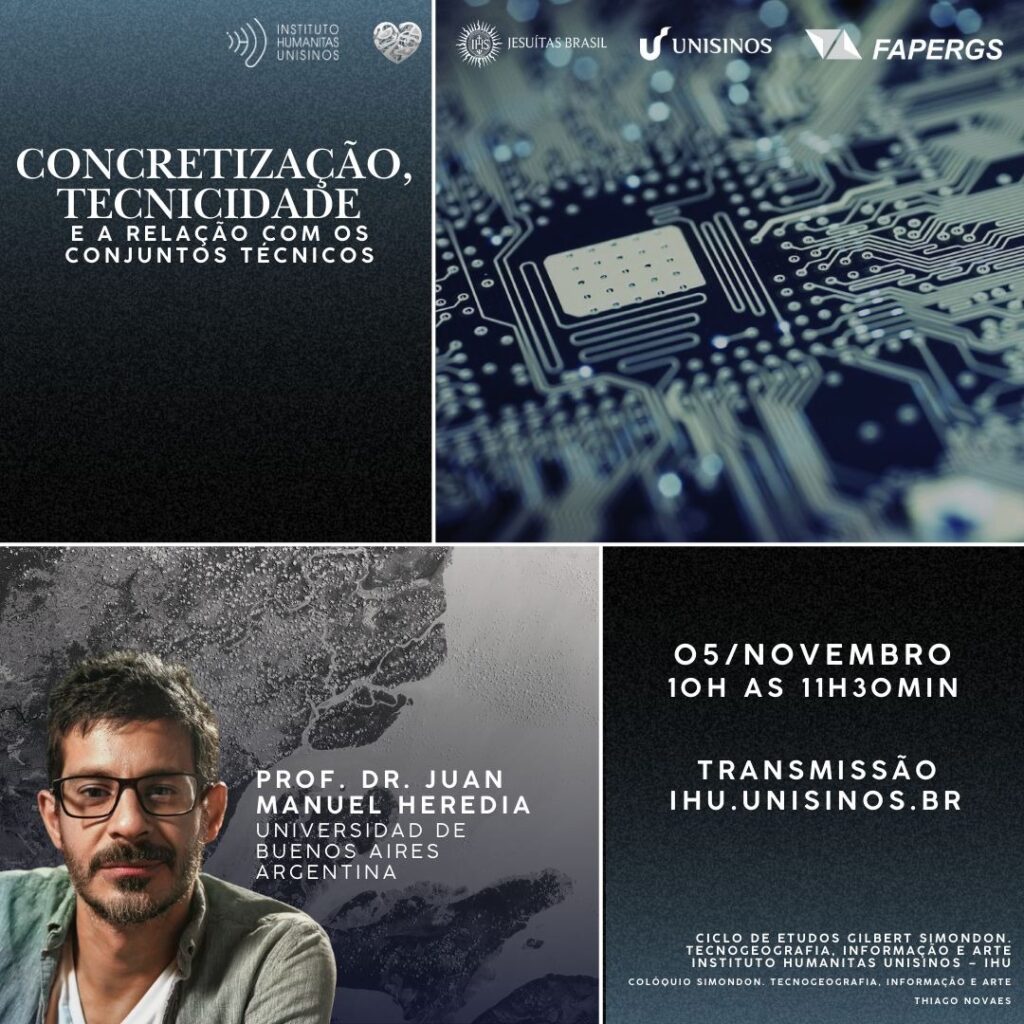 O Ciclo de Estudos Gilbert Simondon e Colóquio Simondon XII – Tecnogeografia, Informação e Arte propõe uma reflexão sobre a articulação entre arte, informação e tecnogeografia à luz de Gilbert Simondon. Compreender as especificidades dos objetos técnicos – que não existem apenas como meros instrumentos, mas operam mesmo como mediadores ativos que coevoluem com o espaço geográfico e a cultura –, permite-nos considerar a individuação técnica enquanto fonte para novas formas de expressão e organização.